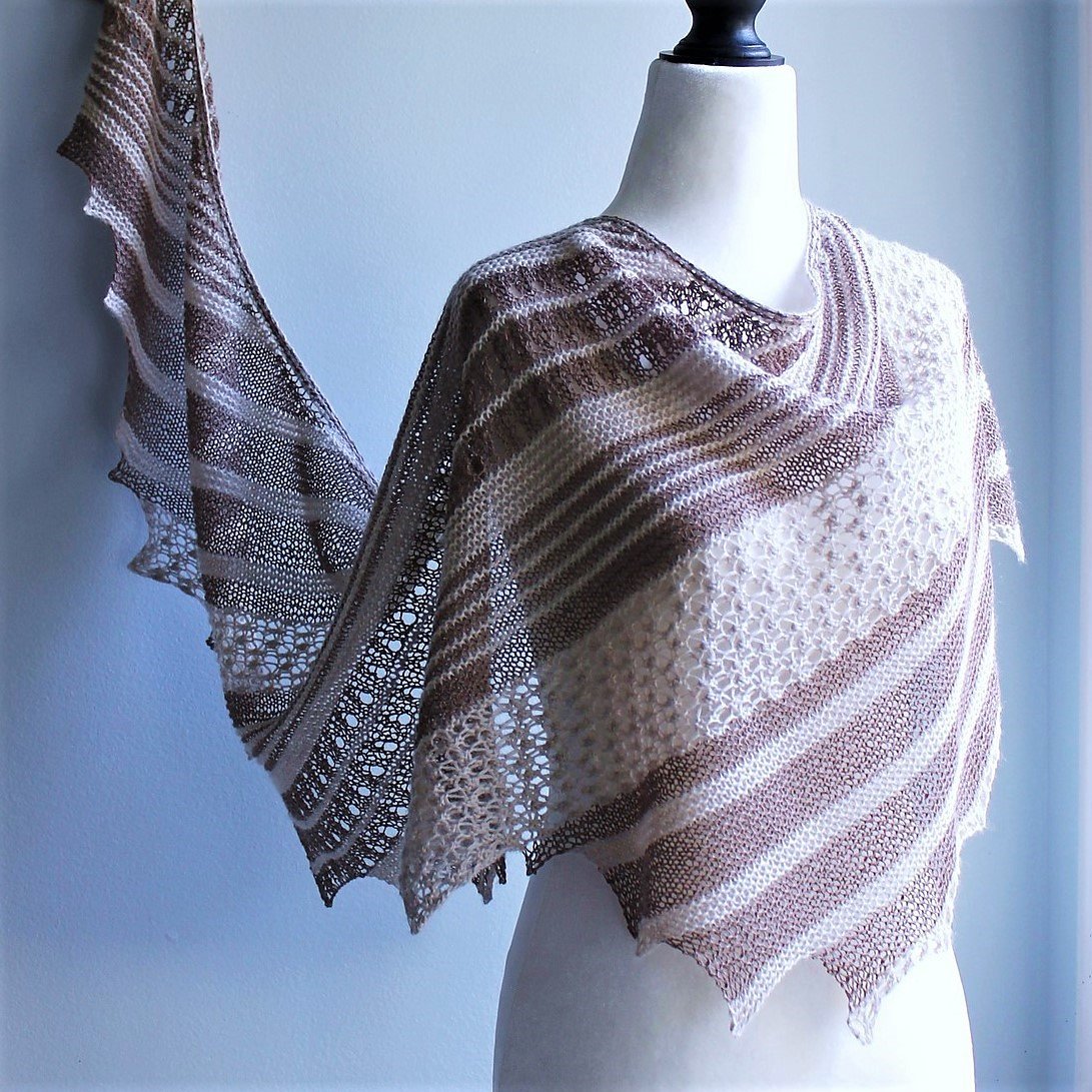 The Frozen Skies is an asymmetrical triangular shawl in elongated and slightly curved shape. It is worked on the bias sideways. The overall shape and stepped edge is achieved by working the simultaneous decreases at one side of the knitted fabric and a set of knitted cast-on stitches at the other side gradually reducing the number of stitches to form a triangle. The stripes of various width and stitch patterns are made in two alternating colours and, if desired, in yarns of different composition and thickness for a dramatic result. There is no yarn cutting when changing colours; both yarn strands are incorporated into a decorative and firm edging.