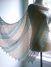 The shawl is knit in two colors with fingering weight yarn. One of the unique features of this design is the shawl's edge stitches, which are worked in a two-tone pattern. When changing the color of the stripes, the unused yarn is not cut or carried over to the next section, but is used in the selvage stitches.