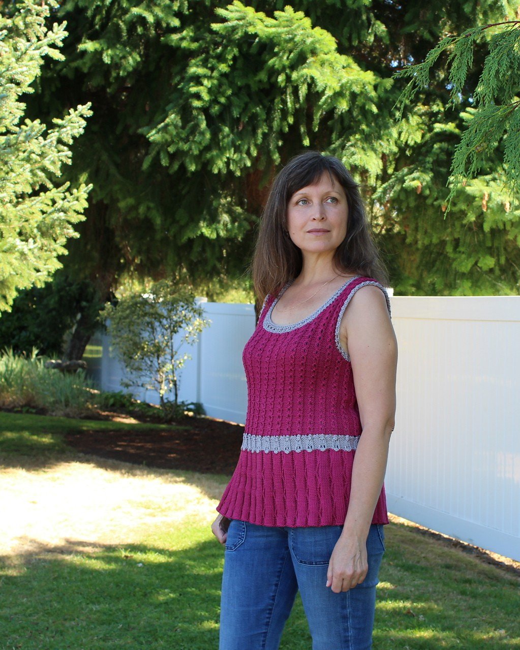 The top is designed to fit with about 2-3 inches of positive ease. For finished measurements see Schematics on the last page.