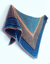 The shawl is knit in textural stitch patterns of different complexity from plain garter and eyelet stitch patterns to two-colour slip-stitch and not so commonly used variation of brioche stitch. The yarns in three colours contrast with each other to some extent and add even more visual interest to the finished shawl.
