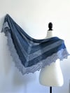 The shawl is knit in a light fingering weight yarn using two colours, where the dark blue used as the main colour, and the light blue is used for the two-colour eyelet sections and the lace border.